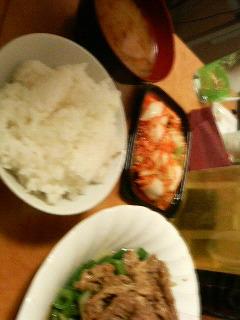今日は、生姜焼きと朝の残り物の味噌汁とどこから来たのかキムチです。